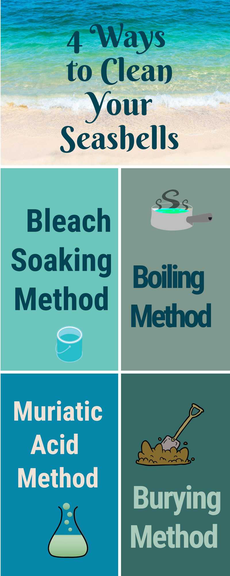 There are 4 popular methods you can use to clean your seashells. The method you choose may depend on your circumstances, time and the type of shells.