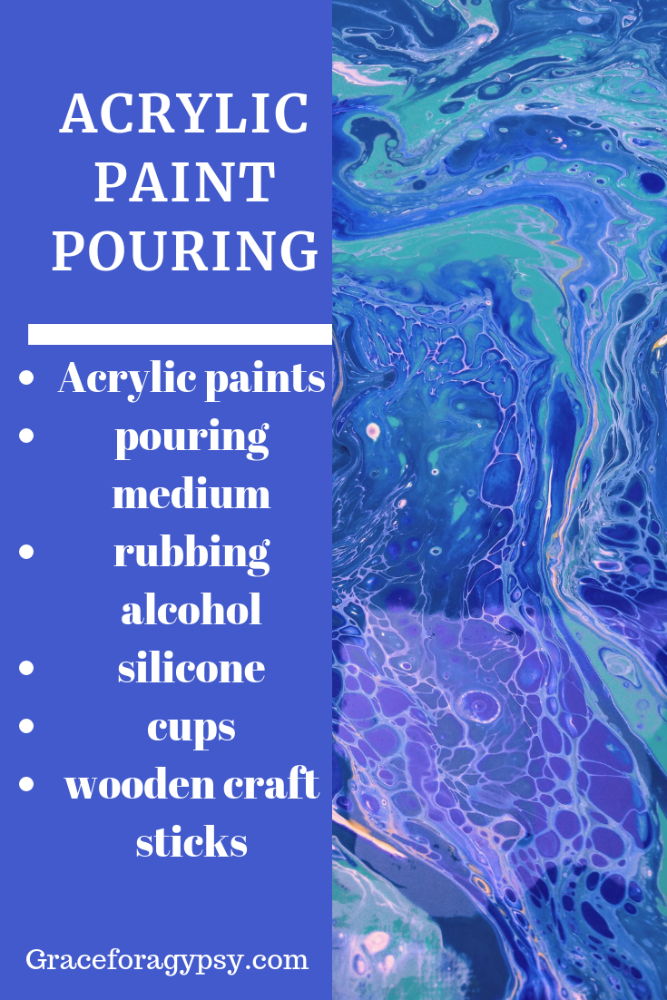The supplies needed for acrylic paint pouring are varied, but I will list the supplies I have used. The technique is unique to the artist as are the supplies used in creating the paintings. There are many different recipes for the acrylic pouring paints, but they all involve some basic ingredients.
