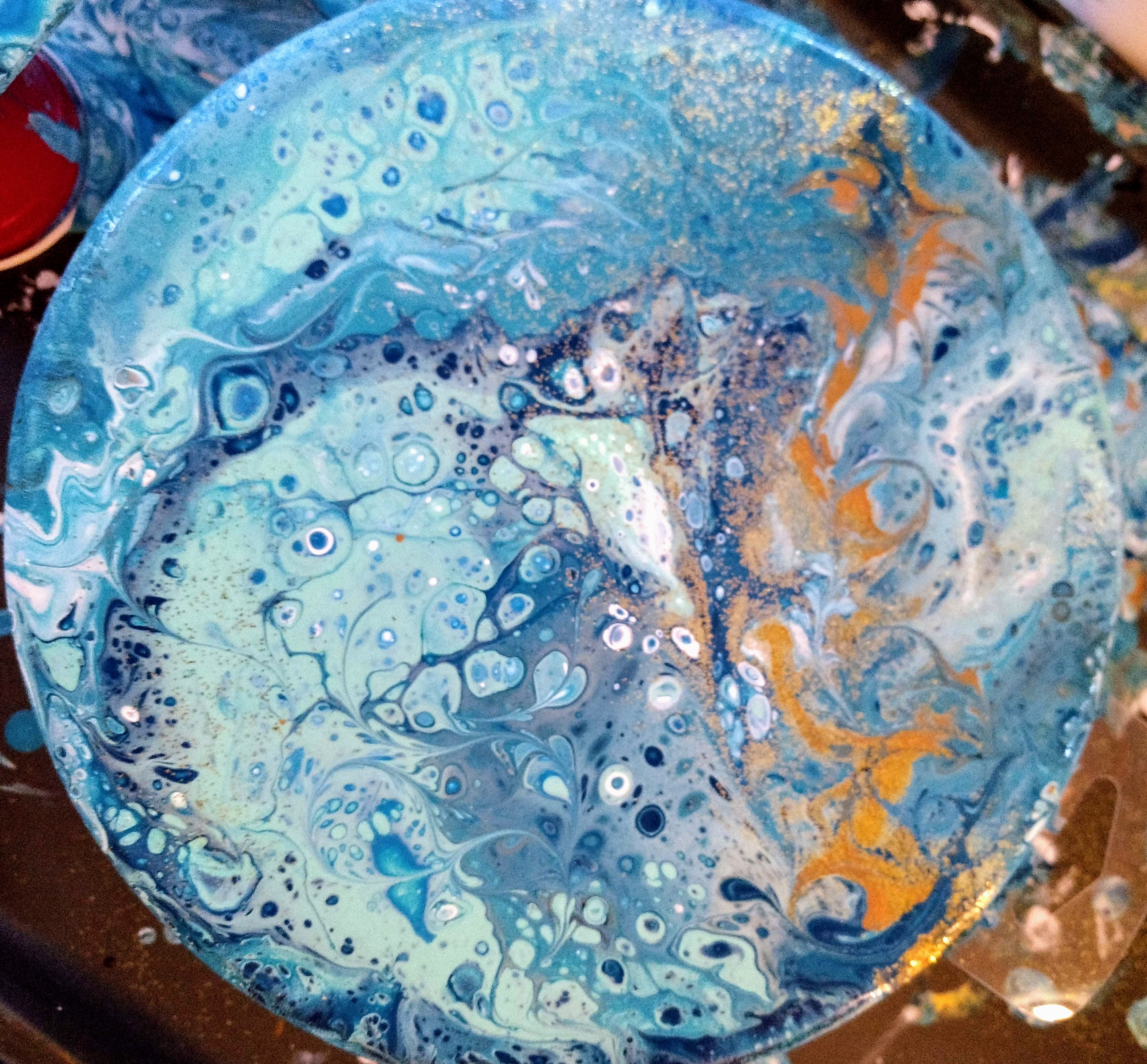 Acrylic paint pouring is a new painting technique that I have been following for a couple of months. It involves acrylic paints, a pouring medium, silicone, or other products that create a fluid painting with cells.
