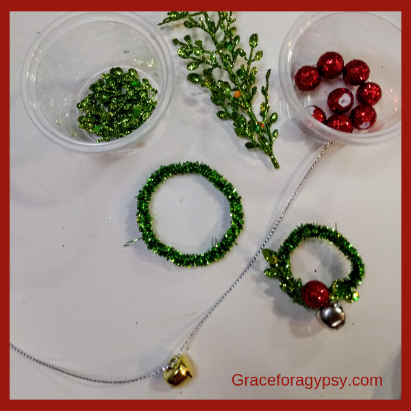 Make a wreath that fits over the dino’s head with the green pipe cleaner. Embellish the wreath with small greenery, berries, jingle bells, etc.