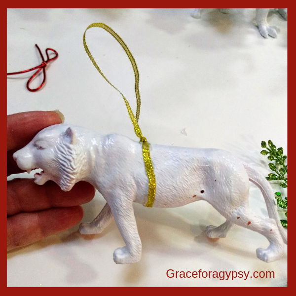 Make a loop with your ribbon that you use for hanging your ornament. Leave tails on the loops long enough to wrap around the belly of your dino and hot glue to secure it.