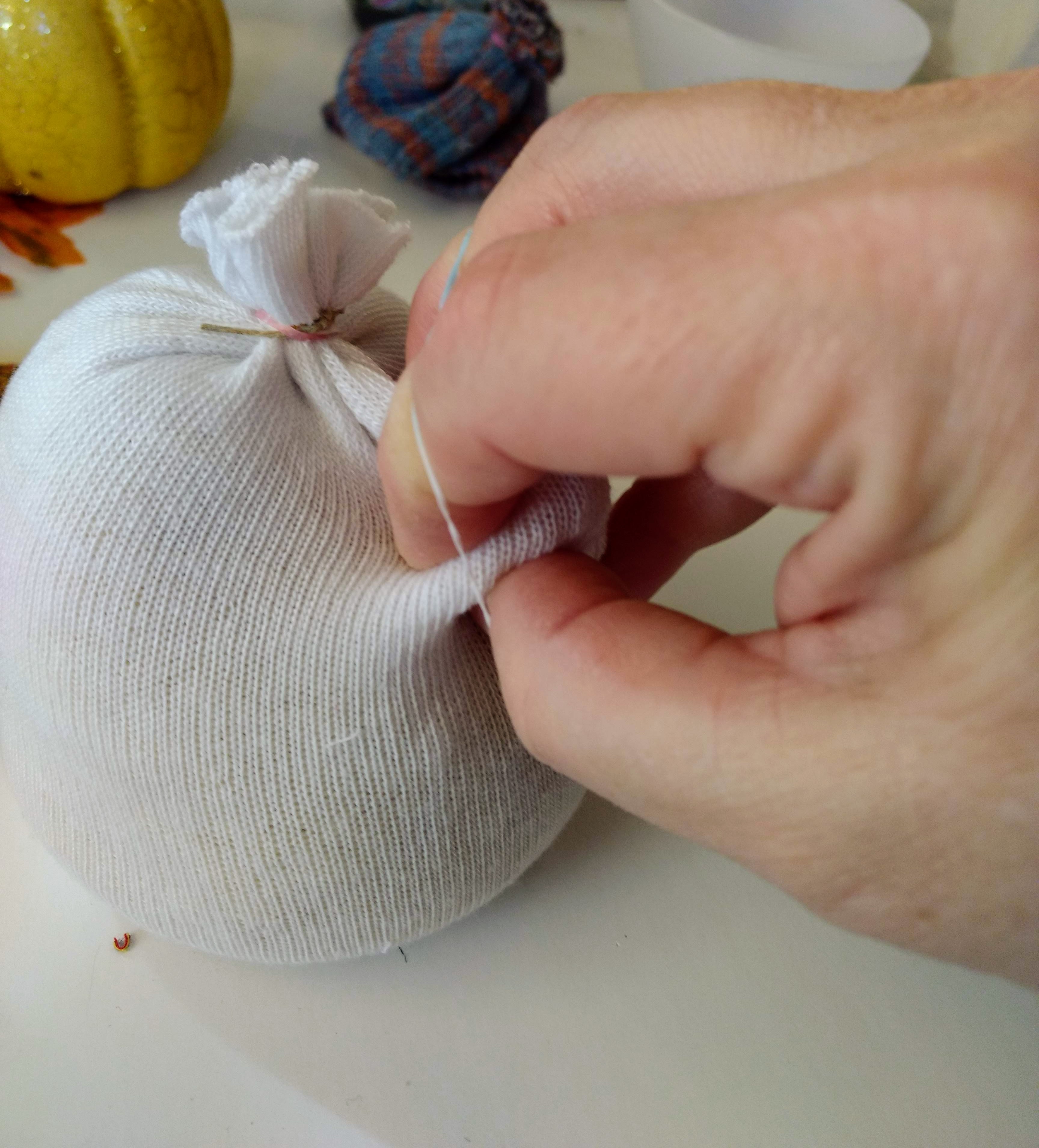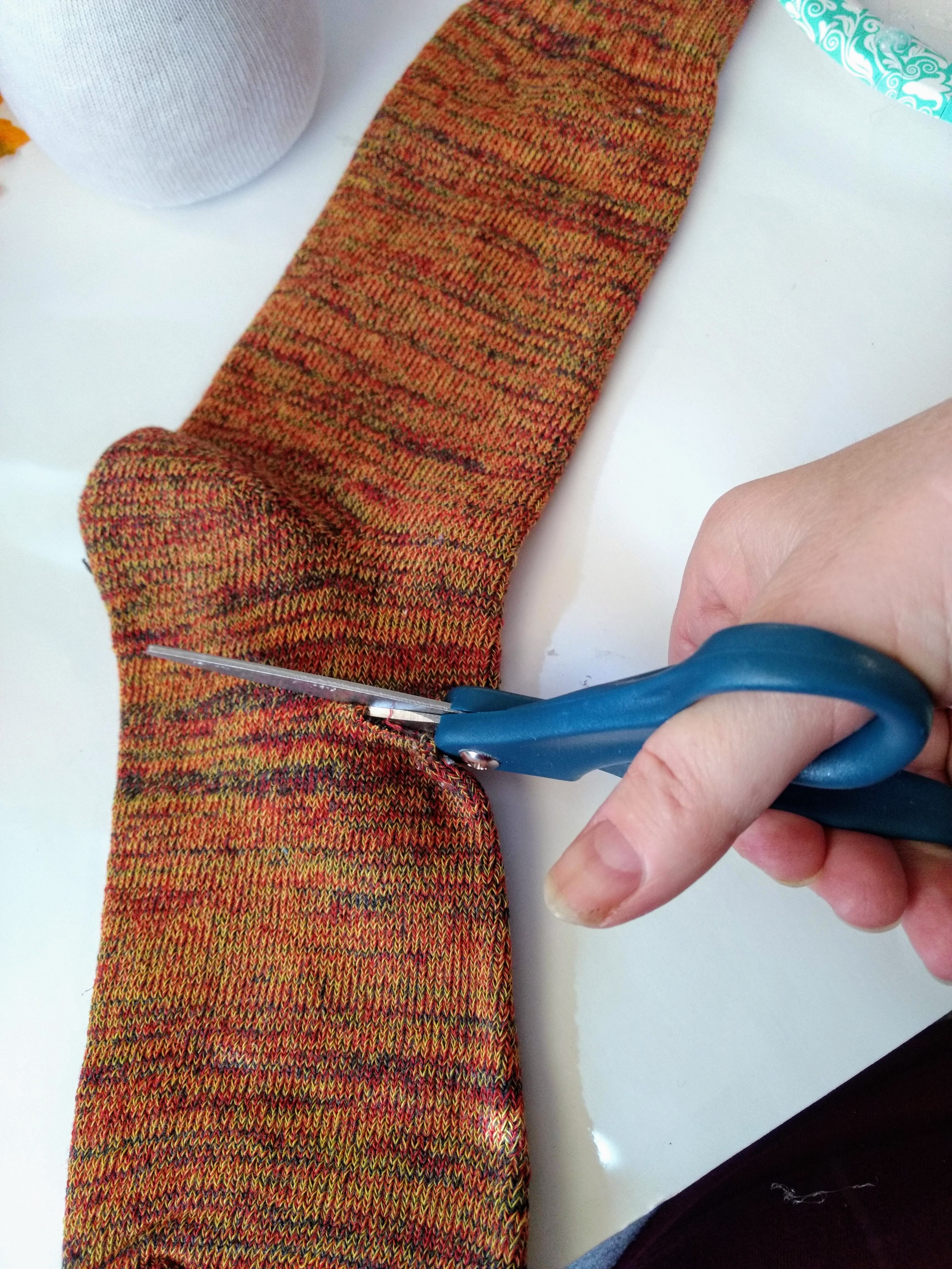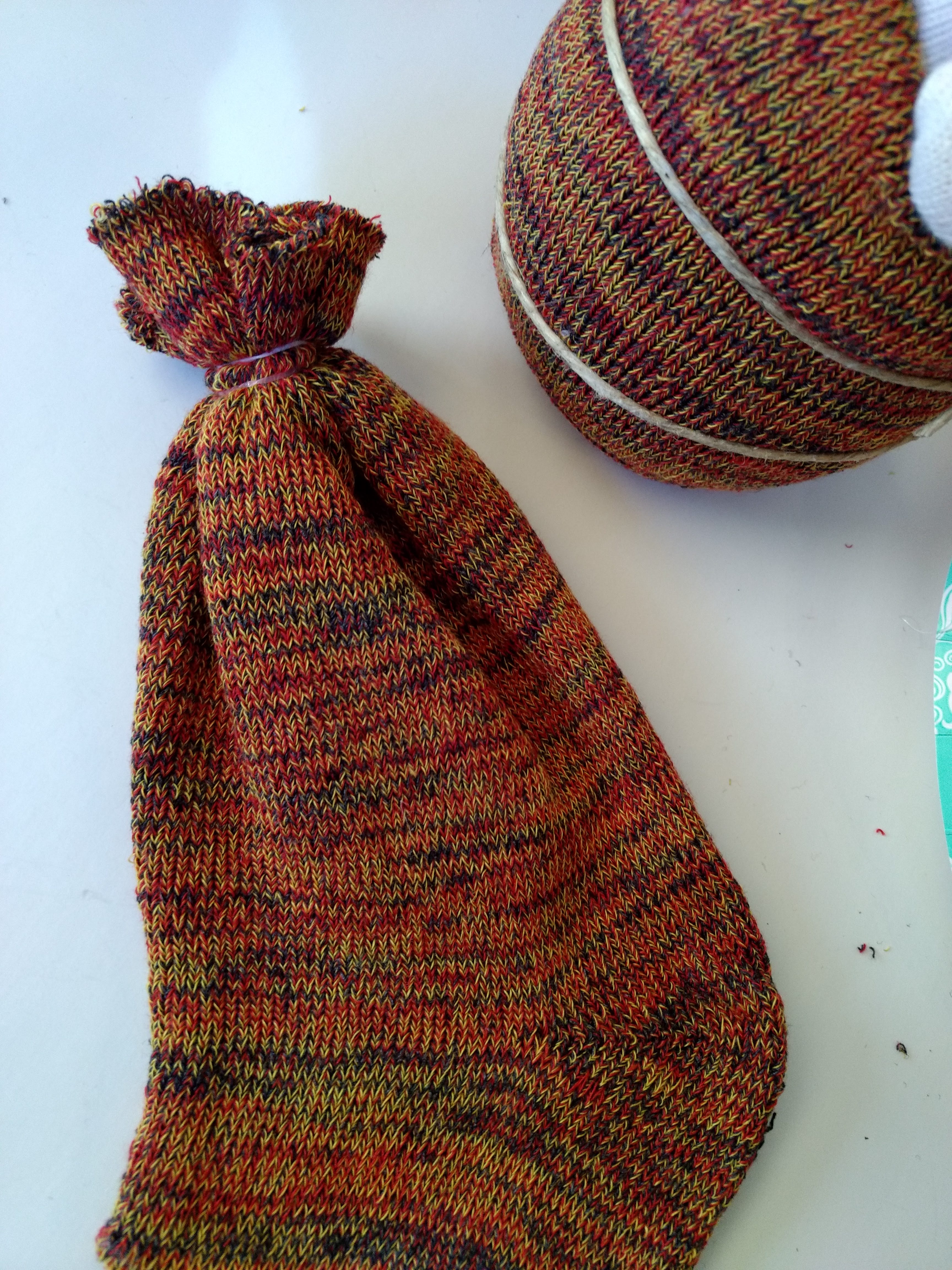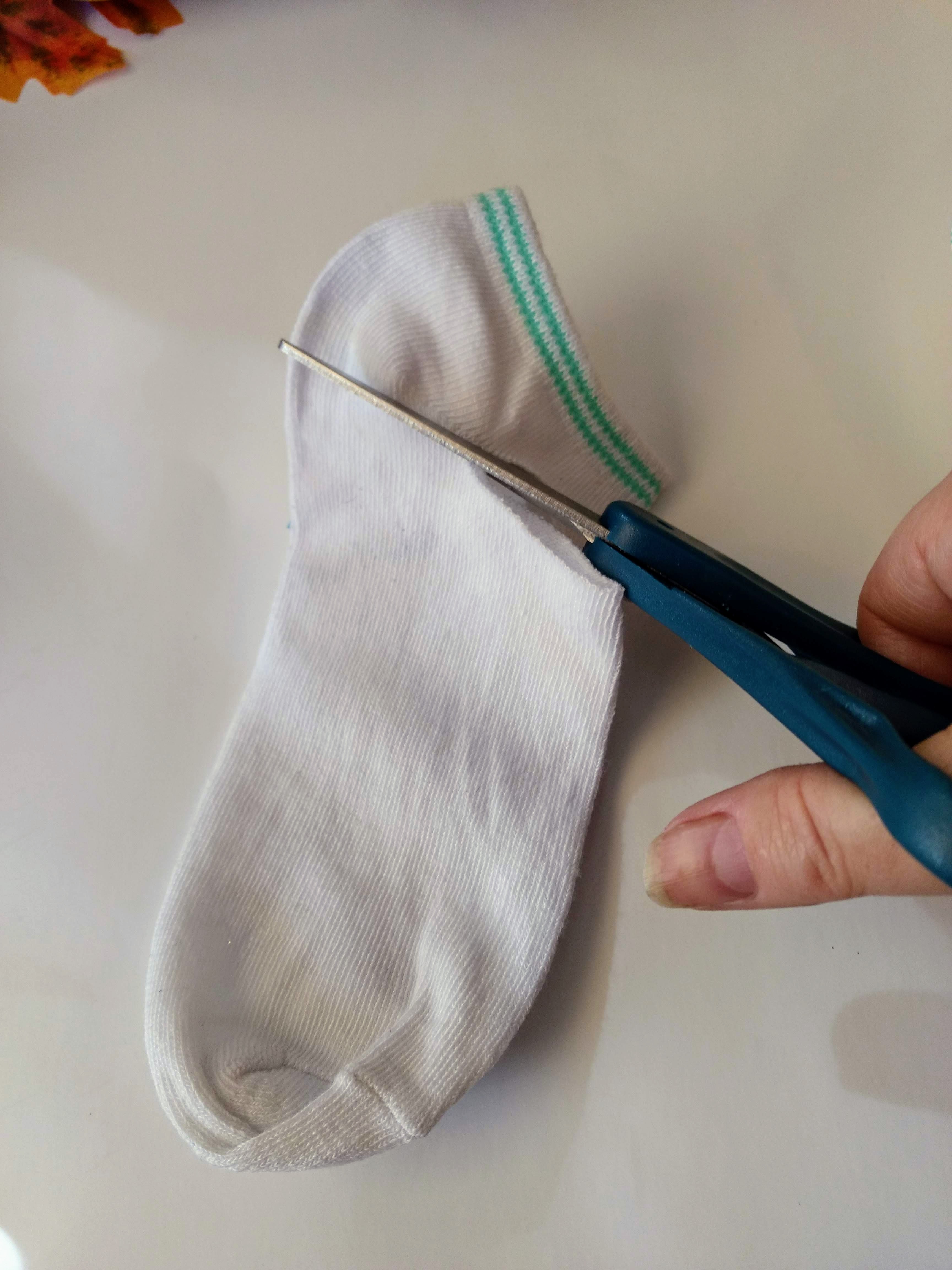 I cut the thick band off the sock and gather the ends and tie them with rubber band hair tie, making a little pompom.