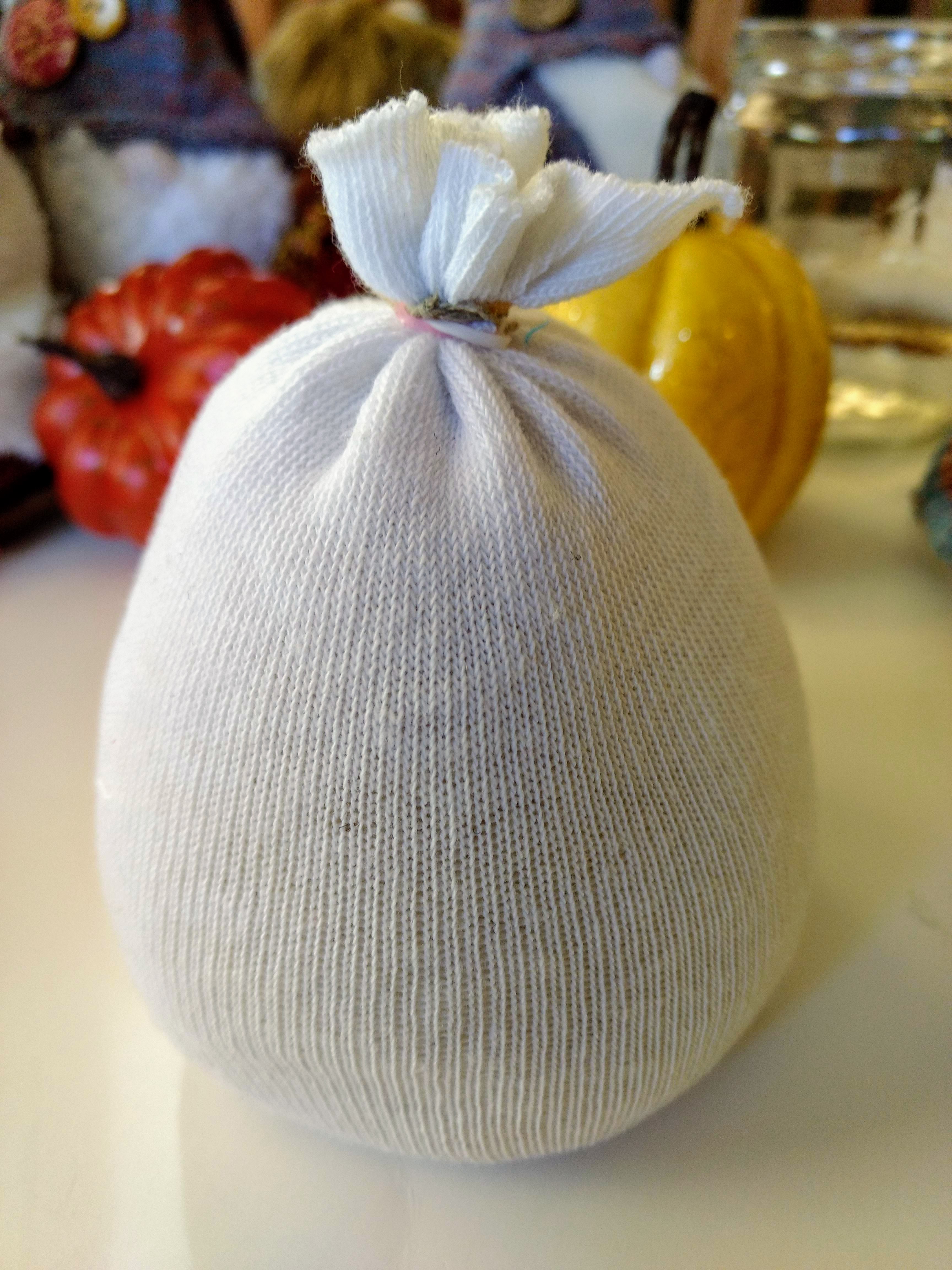 To keep the sock from stretching out too much, tie some just rope around the gnome’s body and tie on the side. This will help hold his shape and helps keep the sock from stretching out.