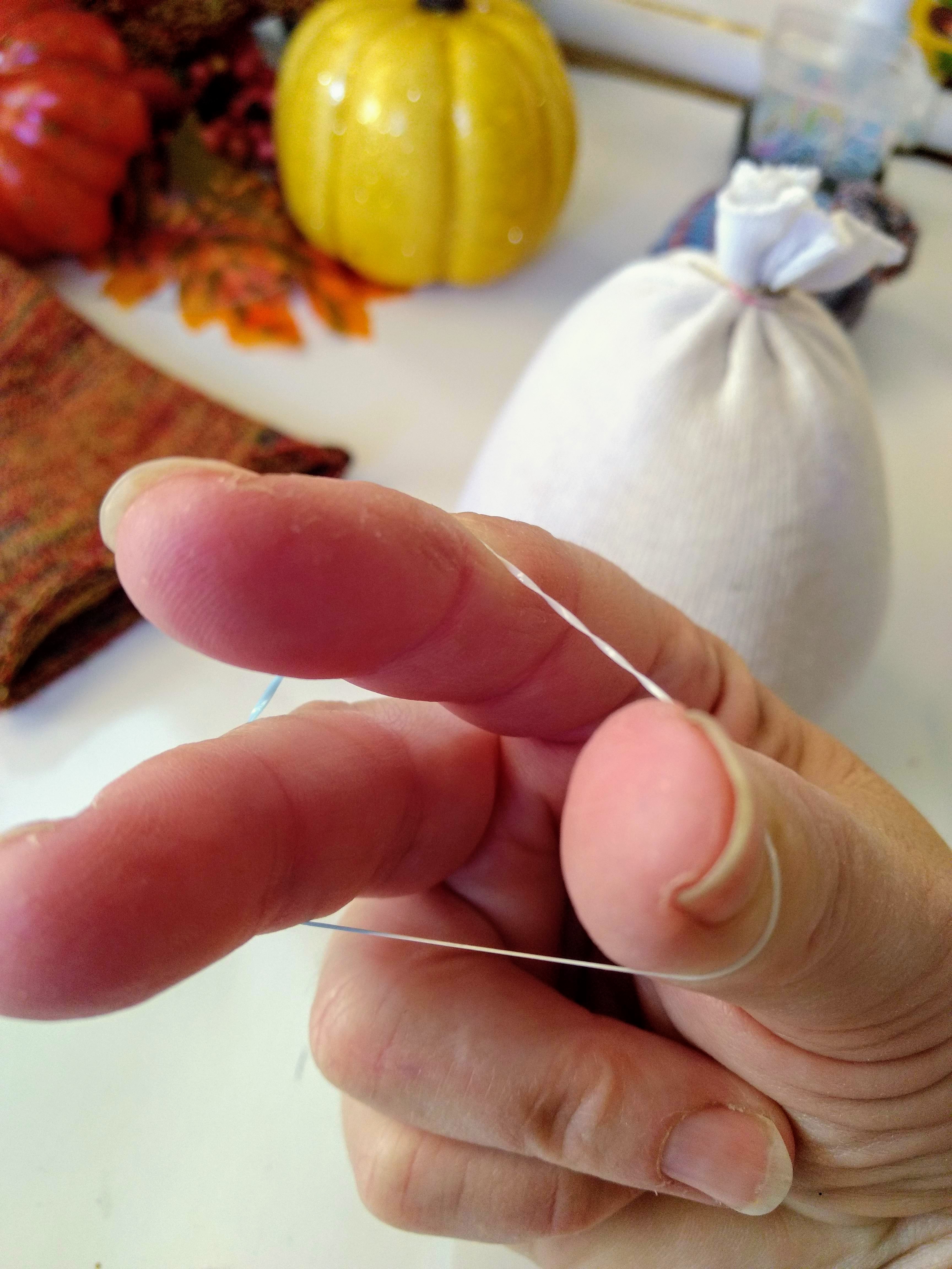 Pinch off a little bit for his nose. Secure it with a tiny hair tie. For extra security tie around the rubber hair tie with string. Cut ends of string short.