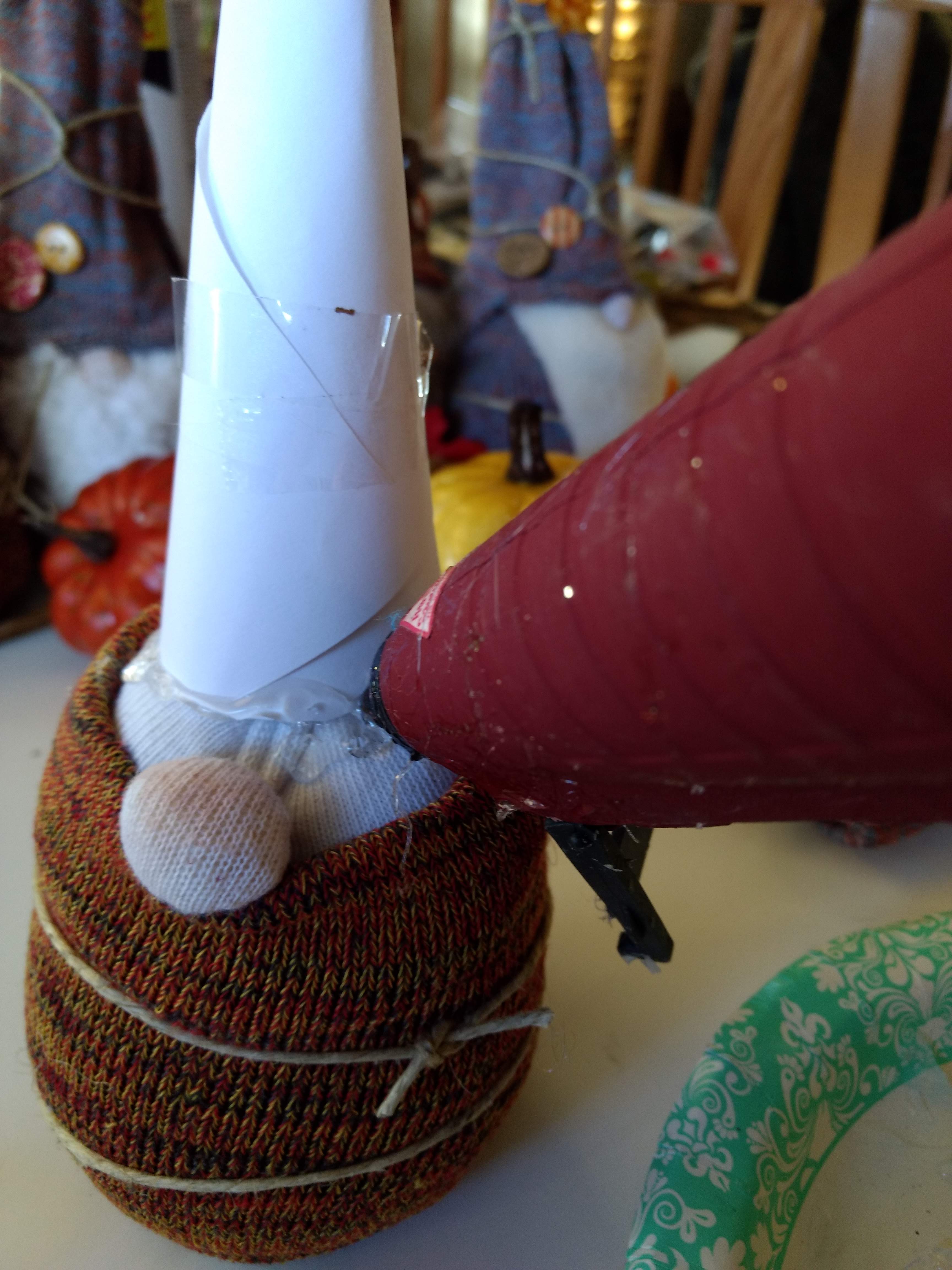 With the heel towards the back, pull the sock over the cone, covering the face of the gnome with just the nose sticking out.