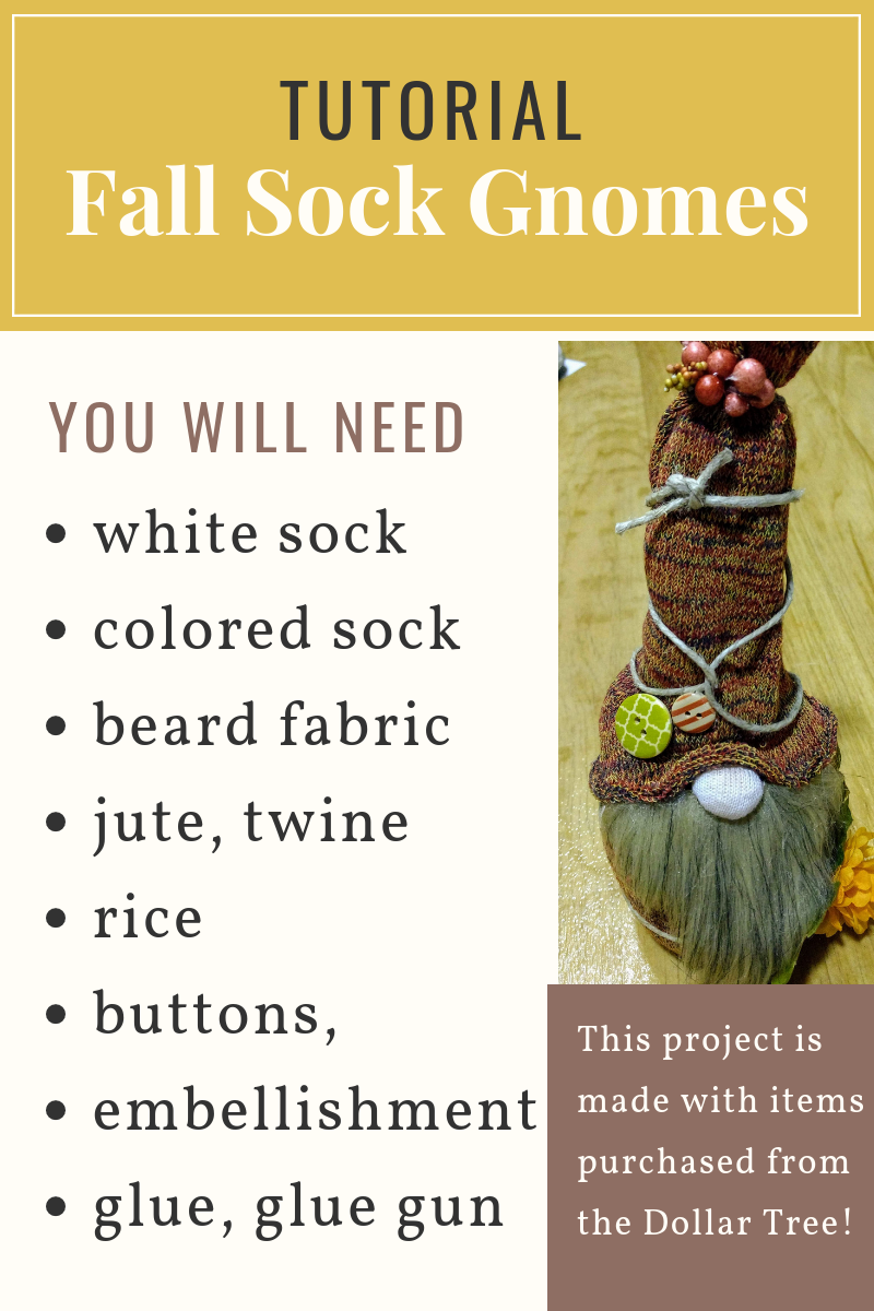 They can be made for almost any holiday. I did the ones in this tutorial for fall. These can be used to decorate for fall or used on a Thanksgiving tablescape. Sock gnomes can also be made for Christmas, Valentine’s Day, 4th of July or any other holiday that you can find specialty socks.